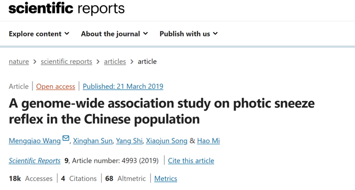 [2] Wang, Mengqiao, et al. "A genome-wide association study on photic sneeze reflex in the Chinese population." Scientific reports 9.1 (2019): 4993.