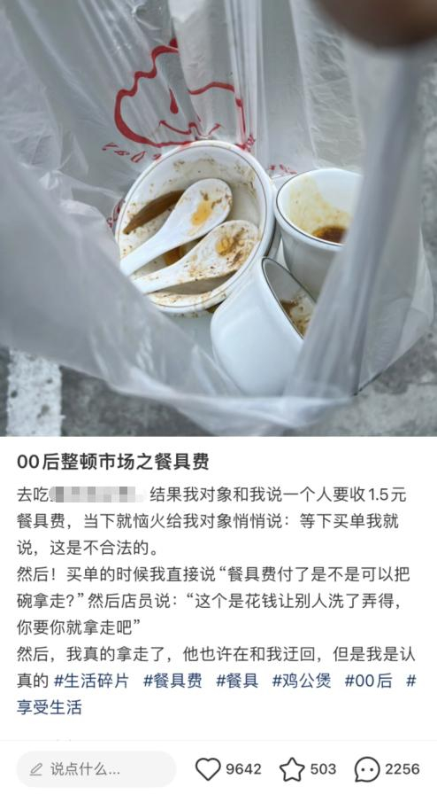 封面新闻记者注意到,此前,“00后整顿餐具费”的话题在网上引发热议。一网友分享自己在用餐时,发现餐厅要收1.5元的餐具费,买单时他问道:“餐具费付了是不是可以把碗拿走?”简单理论后,在店员同意的情况下,最终他用塑料袋将餐具打包带走。