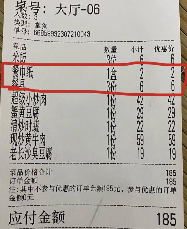 餐具收费 网友晒图