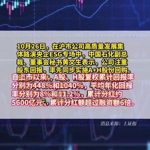 【#中国石化#:上市以来累计分红约5600亿元,超过市场融资总额6倍】10月26日,在沪市公司高质量发展集体路演央企ESG专场中,中国石化副总裁、董事会秘书黄文生表示,公司注重股东回报,率先同步实施A+H股份回购。自上市以来,A股、H股复权累计回报率分别为448%和1040%,平均年化回报率分别为8%和11.2%,累计分红约5600亿元,累计分红额超过融资额6倍。同时,为维护公司价值及股东权益,公司于2022年率先同步实施了A+H股份回购,使用资金41.88亿元,并于2023年持续开展A+H股份回购,目前已回购A股7800万股,使用资金4.59亿元;回购H股6527万股,使用资金2.88亿港元。#中国石化称上市以来累计分红约5600亿元#