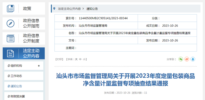 广东省汕头市市场监管局通报2023年度定量包装商品净含量计量监督专项抽查结果