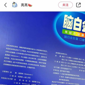 亮亮表示,自己未服用过褪黑素,但了解一些褪黑素的功效。看到脑白金含量表(原料成分介绍)之后,她也没有购买,“补品最起码也是营养品,而不(应)是功能性激素。”