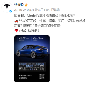 10月27日一早,特斯拉官方微博发布消息称,国产Model Y高性能版价格上调1.4万元,调整后售价36.39万元。而后轮驱动标准版和长续航版Model Y则价格保持不变,起售价分别为26.39万、29.99万元。