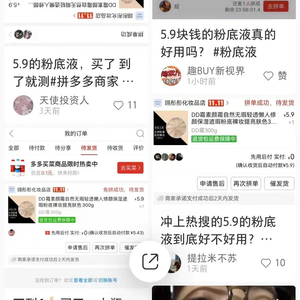最近一博主测评了电商平台上一款售价5.9元的粉底液,据称容量300g,是普通粉底液的10倍,价格却只要个位数,且成分表“全绿”。一时间引起全网跟风购买及测评,#厂家称5.9元粉底液是活动价#、#5.9元粉底液日销5万单暴涨100倍#等话题一度冲上热搜。