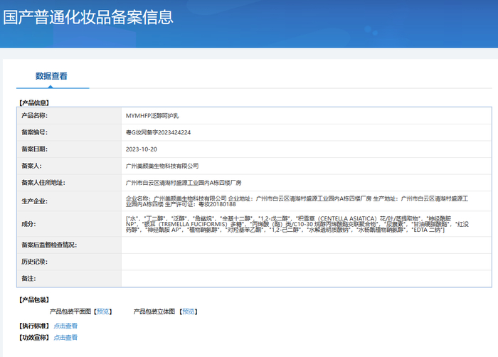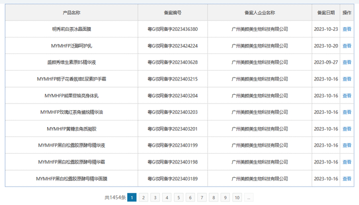 根据国家药监局备案系统查询到的信息,广州美颜美生物科技有限公司共有产品注册信息1454条,其中,2023年6月到10月,4个月间就新增了100款产品。