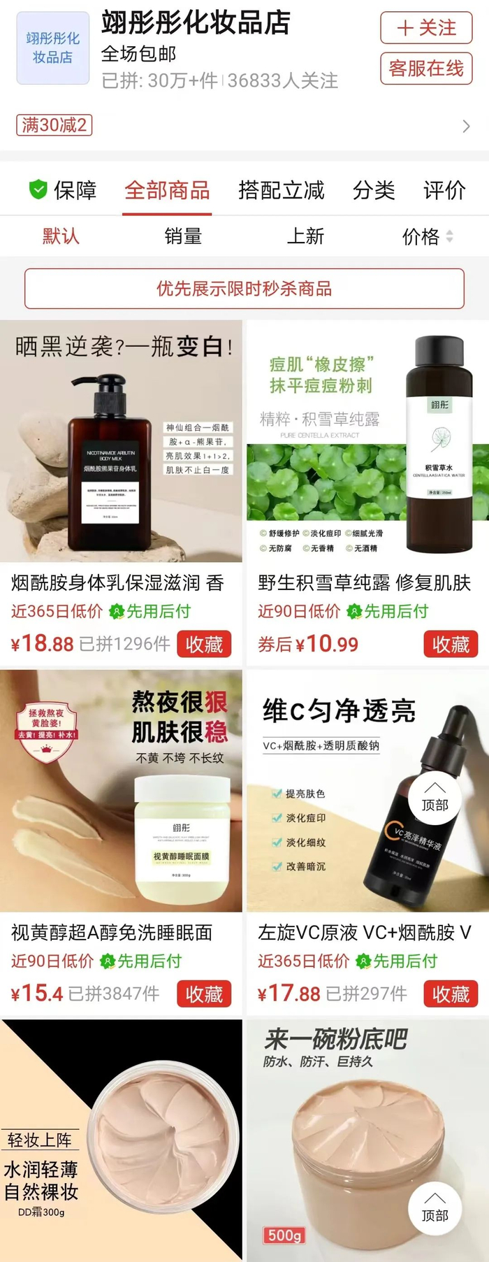 观察电商平台上“翊彤化妆品店”销售的产品,基本都是“便宜大碗”的风格。