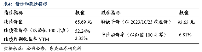 ■  当前转换平价为93.63元,平价溢价率为6.81%。转股期为自发行结束之日起满6个月后的第一个交易日至转债到期日止,即2024年05月01日至2029年10月24日。初始转股价13.81元/股,正股泰坦股份10月25日的收盘价为12.93元,对应的转换平价为93.63元,平价溢价率为6.81%。