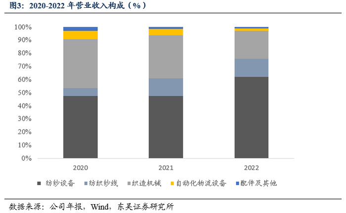 ■  公司主要营收构成稳定,公司主要产品包括纺纱设备、纺织纱线和织造机械三大类产品,为其主要营收来源。2020-2022年,公司纺纱设备占营业收入的比例分别为47.53%、47.50%和62.21%,纺织纱线占营业收入的比例分别为6.15%、13.53%和13.62%,织造机械占营业收入的比例分别为37.03%、32.93%和21.24%。
