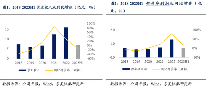 ■  2018年以来公司营收稳步增长,2018-2022年复合增速为21.60%。自2018年以来,公司营业收入总体呈现稳步增长态势,同比增长率“V型”波动,2018-2022年复合增速为21.60%。2022年,公司实现营业收入16.01亿元,同比增加28.74%。与此同时,归母净利润也不断浮动,2018-2022年复合增速为17.17%。2022年实现归母净利润1.30亿元,同比增加78.97%。