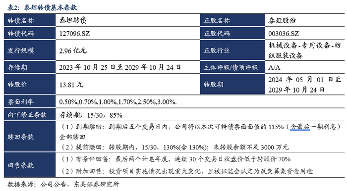 ■  泰坦转债(127096.SZ)于2023年10月25日开始网上申购:总发行规模为2.96亿元,扣除发行费用后的募集资金净额用于智能纺机装备制造基地建设项目、杭州研发中心建设项目及补充流动资金。