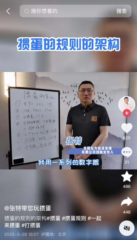 在这波掼蛋热潮中,社交媒体上还出现了一批掼蛋博主,北京太和东方投资管理有限公司创始合伙人张特是名掼蛋爱好者。从今年2月起,他开始在抖音上分享一些惯蛋技巧与心得的短视频。