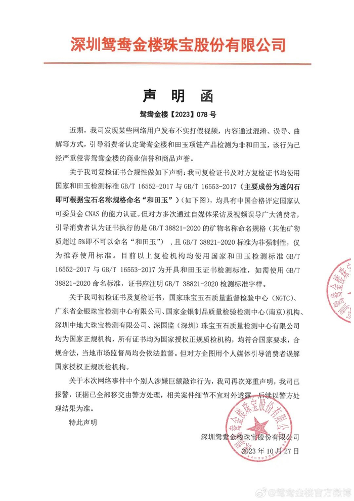 针对小杨哥所售鸳鸯金楼和田玉项链是否有假,10月27日,贝壳财经记者在抖音联系了三只羊网络企业客服,对方表示,三只羊所售产品均为正品,支持消费者前往正规有资质检测机构检测,消费者可以提供相应的检测证明,三只羊会为自己的行为负责。此外,客服表示,鸳鸯金楼和三只羊有合作,但具体产品信息客服并不清楚。