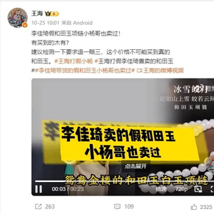 近日,王海发布视频称,消费者在李佳琦直播间597元购买的鸳鸯金楼和田玉项链,NGTC实验室鉴定结果为“碳酸盐-透闪石质玉项链”。而同款项链也出现在小杨哥直播间,售价319元。