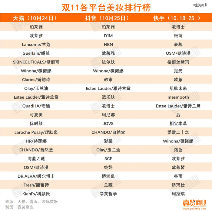 10月25日,天猫官方平台“天猫大美妆”发布了《天猫快速消费品双11预售首日品牌榜单》(根据10月24日20:00- 23:59预售定金情况测算出预售有效成交金额),结合10月18日抢跑的快手、10月20日开卖的抖音,可窥见美妆行业在今年双11的新变化。