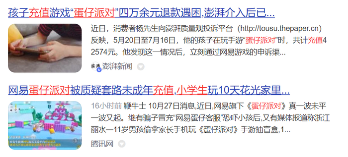 在网页中搜索蛋仔派对,就能搜到大量学生背着家长给游戏充值几千到十几万元不等,又遭遇退费难的新闻。