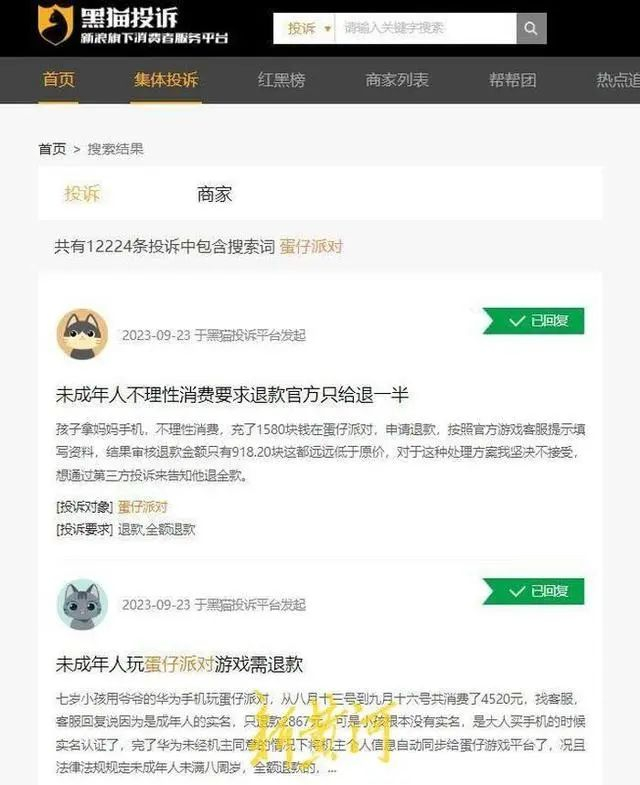记者从黑猫投诉平台输入“《蛋仔派对》”关键词检索发现,共有1.2万余投诉,其中大多数与未成年人充值有关。其中,未成年人年龄大多在10岁左右,有的甚至只有6岁,达不到该游戏玩家至少年龄8岁+的要求。家长们普遍反映,孩子都是在绕过实名认证登录后被游戏诱导消费,且丝毫不限制充值金额,在退款时遭遇各种障碍,与《蛋仔派对》官方客服交涉时,对方往往把责任推给游戏合作平台,有的只能退一小部分,有的一分钱都不退。