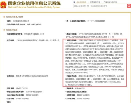 根据北京市场监管局2023年10月16日通报,朗迪制药因药品抽检不合格被从重处罚,责令停产停业整顿30天,没收违法所得及罚款合计超1.4亿。