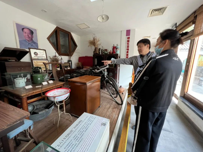 缝纫机、小人书、煤炉子、收音机……时代记忆展厅里的展品大多是从居民手中征集到的,原汁原味重现了过去的胡同生活。看着这些展品,从前的点滴回忆一下子涌上心头。“你看这个小人书,姥爷小时候花一分钱、两分钱就能买来看上半天!”曾经家住史家胡同的刘叔叔带着老伴儿和小孙子前来参观,感叹到“来这里就跟回家似的”。刘叔叔一边看,一边绘声绘色地给孙子讲着展品的故事。小孙子则趴在橱窗前,眨着大眼睛,听得入迷。