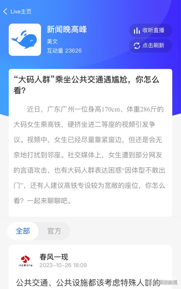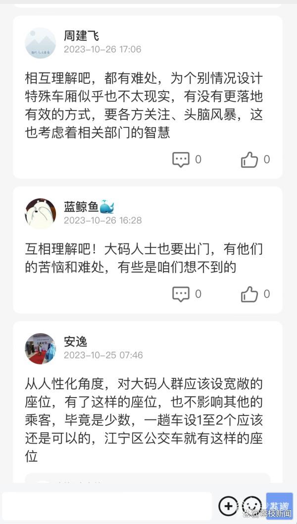 在大蓝鲸平台的直播互动贴下,多数网友都对“大码人群”表示理解和尊重,网友“蓝鲸鱼”说:互相理解吧!大码人士也要出门,有他们的苦恼和难处,有些是咱们想不到的。网友“安逸”说,建议从人性化角度,为大码人群设专门的座位,宽敞一些的,就像老弱病残专座那种,据这位网友了解,南京江宁区的部分公交车已经设有这样的座位。网友“春风一现”附和道:公共交通、公共设施都该考虑特殊人群的出行需求,做好设施配套,没有的可以优化建设。而在网友“周建飞”看来,网上有关设置专门车厢的建议不太现实,至于有没有更为落地有效的方式,需要各方关注、头脑风暴。