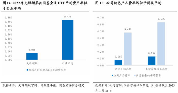 作为长期投资,养老金投资者更关注低费率,先锋领航共同基金及ETF平均费用率低于行业平均和主要竞争对手。1)401K和IRA账户里的资金必须等到退休后才能取出,作为长期投资,费率对养老金的最终回报有重要影响,高费率会显著侵蚀投资收益。2)2022年公司共同基金及ETF产品平均费用率0.08%,远低于0.47%的行业平均水平。公司退休目标、生命策略产品费率远低于同类。