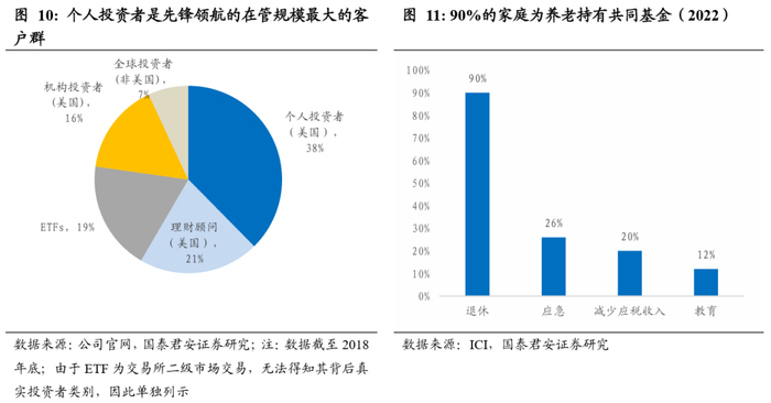现阶段,先锋领航主要服务个人投资者,以满足其养老需求。截至2018年底,按资产管理规模衡量,先锋领航个人投资者(含理财顾问)占比最大达59%,机构投资者占比16%。美国投资公司协会2022年数据显示,90%的家庭持有共同基金的目的为满足养老需求。