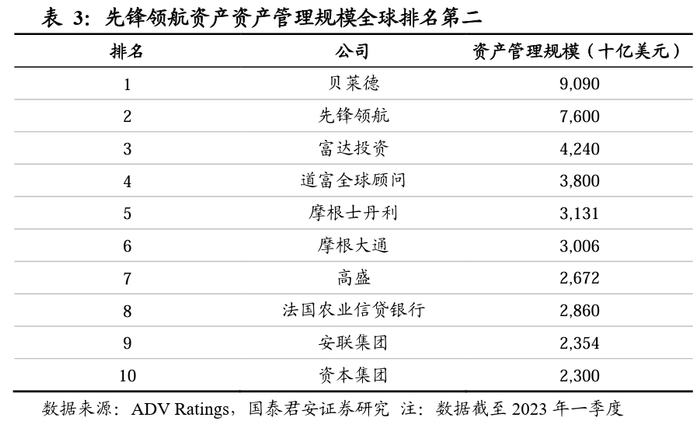 先锋领航资产管理规模7.6万亿美元,全球排名第二。截至2023年第一季度底,先锋领航在全球管理的总资产规模为7.6万亿美元,全球排名第二,略低于贝莱德的9.1万亿美元,大幅领先于排名第三位富达投资的4.2万亿美元。