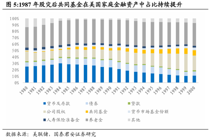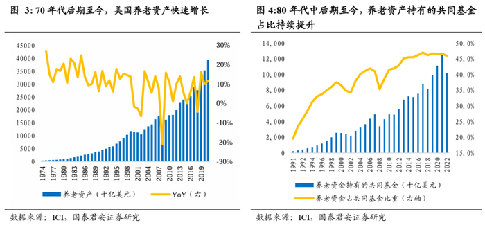 受益于《联邦雇员退休收入保障法》,80年代中后期至今,美国资管行业重点服务于养老金的保值增值需求。1970s美国“婴儿潮”一代面临退休,老龄化加剧,而养老计划未成立独立实体基金,雇员的养老金得不到保障。因此,美国政府于1974年颁布了《联邦雇员退休收入保障法》(EmployeeRetirement Income Security Act /ERISA),要求养老基金的管理人对到期支付的退休金有责任进行保值增值,鼓励退休基金的管理人进行多样化的投资,并且该立法确立了个人退休帐户(IRA)作为重要储蓄工具之一的地位,受益于政府税收政策的推动和IRA的灵活及转移便捷等优势,推出以来账户资金规模快速增长。与此同时,各种相关的职工退休金和养老金方案逐步完善,1981年为储蓄者提供税收优惠的雇主退休储蓄计划401K计划开始推出,私人养老金规模持续高速增长。80年代中后期至今养老资产成为美国资管市场的重要增量资金,养老金账户中的共同基金占基金资产的比重持续提升。