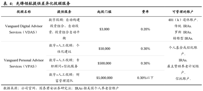 先锋领航通过提供权益类指数产品满足个人投资者的养老需求。1)先锋领航的产品按投资风格进行划分,包括主动管理型以及指数被动型,其中指数被动型产品在管规模最高,占比高达75%;按投资品种划分,包括股票型、固收型、混合型以及货币型,其中权益型占比最高,占比达64%。2)先锋领航还根据客户资产等级的不同提供不同层次的投顾服务。其人工投顾服务(Vanguard Personal AdvisorServices/VPAS)以及智能投顾服务(Vanguard DigitalAdvisor Services/VDAS)针对性满足不同层次客户的个性化需求。此外,其投顾服务体系还包括主要服务于雇主赞助的退休计划参与者的Vanguard ManagedAccount Program(VMAP)以及 Personal Online Advisor(POA)等。