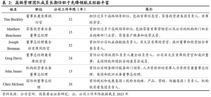 集团创始人约翰·博格被誉为“美国指数之父”。现阶段公司以首席执行官MortimerJ.Buckley为领导核心,践行以指数产品为核心的发展战略。1)成立先锋领航前,约翰·博格担任威灵顿基金管理公司的首席执行官。1975年先锋领航集团成立后,博格并以CEO身份领导公司直至1996年,担任董事会主席直到1999年。2)Mortimer J.Buckley于1991年于哈佛大学经济系毕业后加入先锋领航集团,担任过多个高级领导职位,并于2018年成为CEO。公司高级管理团队由11名董事总经理组成,该团队负责执行公司的长期战略、监督日常运营和管理员工,成员长期任职于先锋领航平均服务年限高达20年,且业务经验丰富,可有效确保公司以指数产品为核心的发展战略长期稳定。