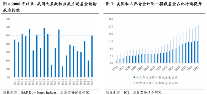 1987年股灾过后,美国股市进入长期牛市行情,股票资产的长期收益更高,同时市场有效性的增强使指数产品长期能够取得高收益,获得养老资产青睐。1)1987年美国股灾过后,美国进入慢牛行情,股票资产的长期收益显著优于债券等资产。受股灾的影响,个人投资者对股市持谨慎态度,股票资产在美国家庭账户中占比下降。为分散风险并进行专业的资产管理,个人客户对共同基金有着巨大且不断增长的需求,共同基金资产占比呈提升趋势。特别是对于风险偏好较低的养老账户资金,逐步将共同基金作为其重要的投资工具之一。2)随着美国股市机构化程度加深、有效性增强,超额收益的获取成本日益抬升,低成本的被动投资回报率优于主动投资。根据先锋领航数据,长期维度来看,如以15年为期,美国市场的主动型股票基金经理跑赢基准的概率仅37%。对于长线投资的养老金而言,被动投资的长期回报率显著优于主动投资,更能满足居民养老需求,逐渐得到养老资产的认可,1990s至今养老金计划持有的共同基金中指数基金占比持续提升。