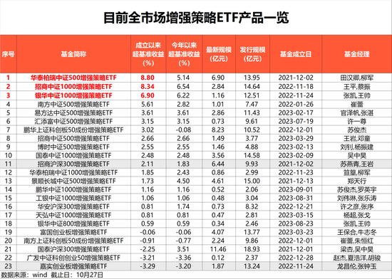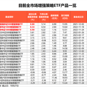 Wind数据显示,截至10月27日,全市场23只产品增强策略ETF产品中,成立以来获取超额收益产品数量18只,占比接近8成。成立以来平均超额回报达2.07%,其中招商中证1000增强策略ETF、华泰柏瑞中证500增强策略ETF回报居前,均超8%。