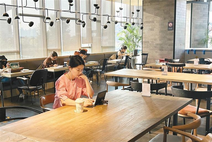新华书店里,读者看书的同时也会点一杯咖啡。
