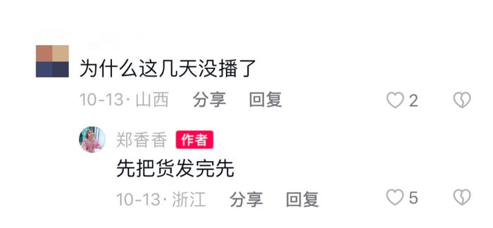而在国庆火了之后,郑香香也选择了停播好几天的方式,直到10月15日才恢复直播。对比此前的马拉松式开工,这次直播仅仅维持了一个多小时,她称自己“嗓子哑了”结束直播。有网友在评论区问她,“为什么这几天没播了”。她回复说:“先把货发完先。”