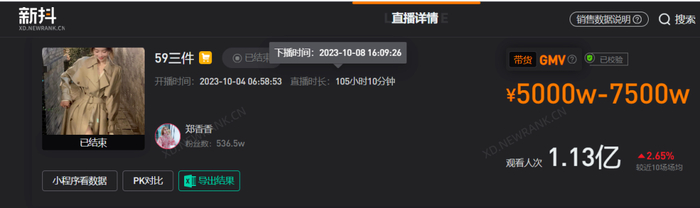 这场长达105个小时的直播,累计场观达1.13亿次,上架了800款商品,销量超百万件,单场带货预估GMV在5000万元-7500万元间/数据来源:新抖