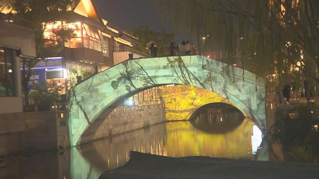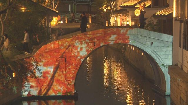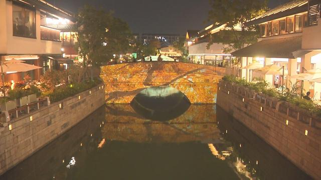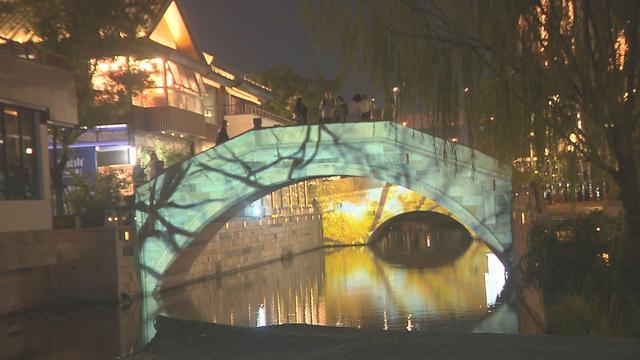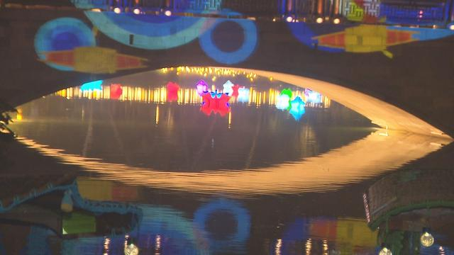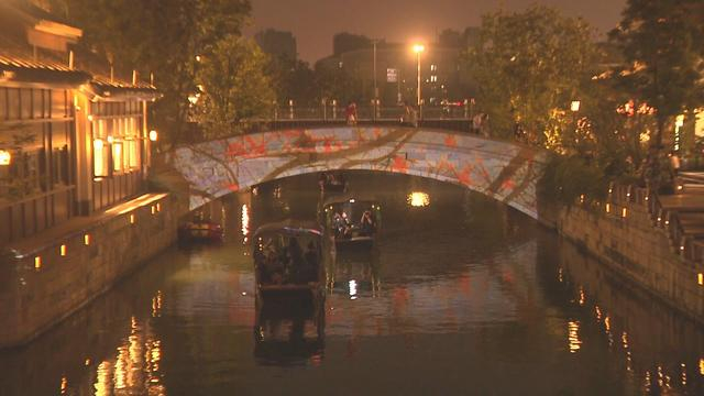 夕阳西下、华灯初上。英国视觉艺术家Celyn Bricker的作品《五季》由一系列人工智能生成的视频作品投影于映月桥、涵春桥、香花桥、隆