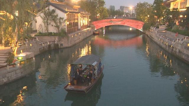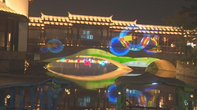 水间,船儿荡漾起水乡的温柔意境。游客靳女士团建来到这里,被古镇景色所吸引,想欣赏下夜景,想不到遇到了光影秀,很是陶醉。“今天的