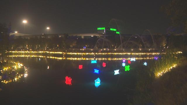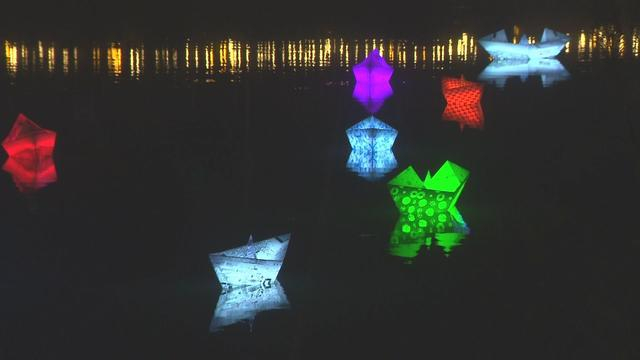 画船听雨眠”为灵感,一只只漂浮于河面之上的光体“纸船”,在意象上勾连起旧时水乡的“乌篷船”,将“天/河/水/船/雨/人”融为一体。在光影与流