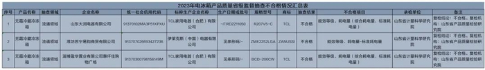 本次抽查发现潍坊苏宁易购商贸有限公司、淄博盈华置业有限公司惠仟佳购物广场、山东大润电器有限公司3家销售者的3批次产品不符合相关标准的要求,不合格项目为耗电量、能效等级。其中,销售者潍坊苏宁易购商贸有限公司、生产者TCL家用电器(合肥)有限公司对检验结果提出异议,并申请复检;经复检后,维持初检结论。 对本次抽查发现的不合格产品销售者,山东省市场监督管理局已责成相关市场监督管理部门依据《中华人民共和国产品质量法》《产品质量监督抽查管理暂行办法》以及国家市场监督管理总局、山东省市场监督管理局关于监督抽查的有关规定,做好不合格结果处理工作。