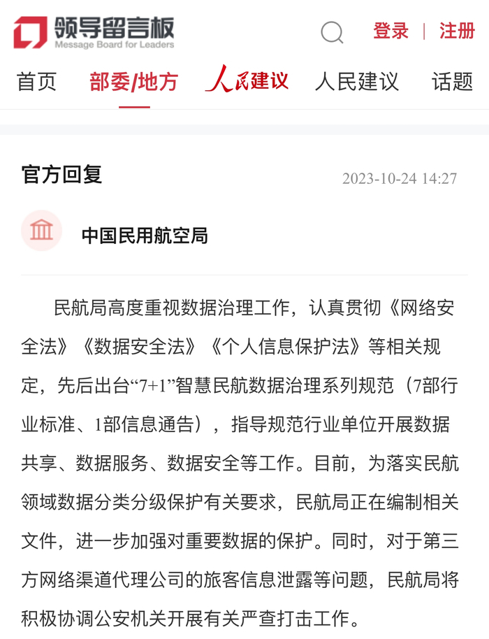 民航局方面还表示,目前,为落实民航领域数据分类分级保护有关要求,民航局正在编制相关文件,进一步加强对重要数据的保护。同时,对于第三方网络渠道代理公司的旅客信息泄露等问题,民航局将积极协调公安机关开展有关严查打击工作。