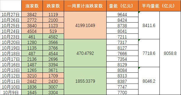 再看涨跌家数及量能。如下图所示,本周是10月以来最扬眉吐气的一周,诠释了什么是“物极必反”。