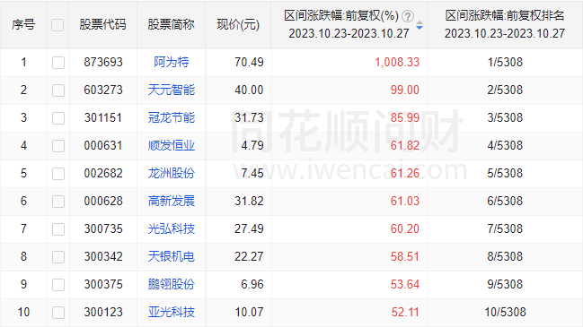 本周上涨最多的个股,除去周五在北交所上市的阿为特直接收涨10倍外,周一上市的天元智能也在5天里几乎翻倍。