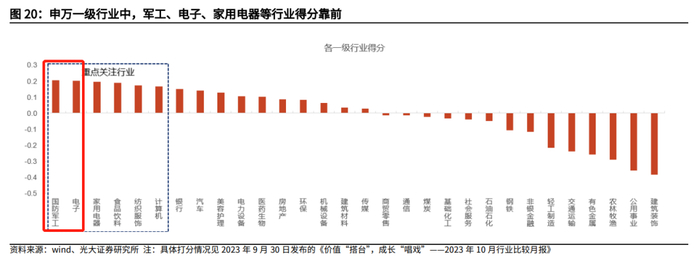 此外,光大证券张宇生10月22日的一份研报指出,沪指跌破3000点后快速反弹的情景下,通过行业比较打分体系对各个行业进行打分,在申万一级行业中,国防军工、电子、家用电器、食品饮料、纺织服饰及计算机行业的得分最靠前,10月份值得重点关注。