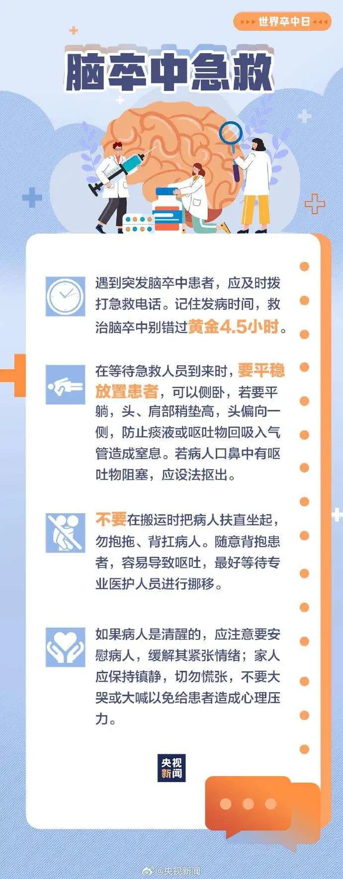 10月29日是“世界卒中日”。今年的主题是“卒中识别早,救治效果好”。卒中亦称中风,包括缺血性脑卒中和出血性脑卒中,指由于脑内血管狭窄或闭塞和血管破裂等所致的一组器质性脑血管疾病,以突然起病、迅速出现神经功能障碍作为其主要临床特征。