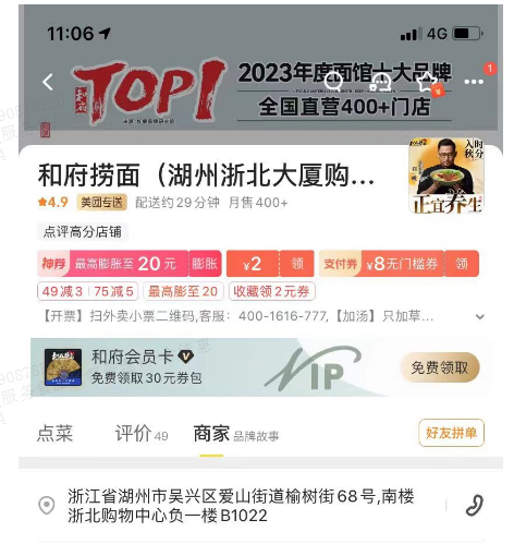 外卖平台名称:和府捞面(湖州浙北大厦购物中心店)