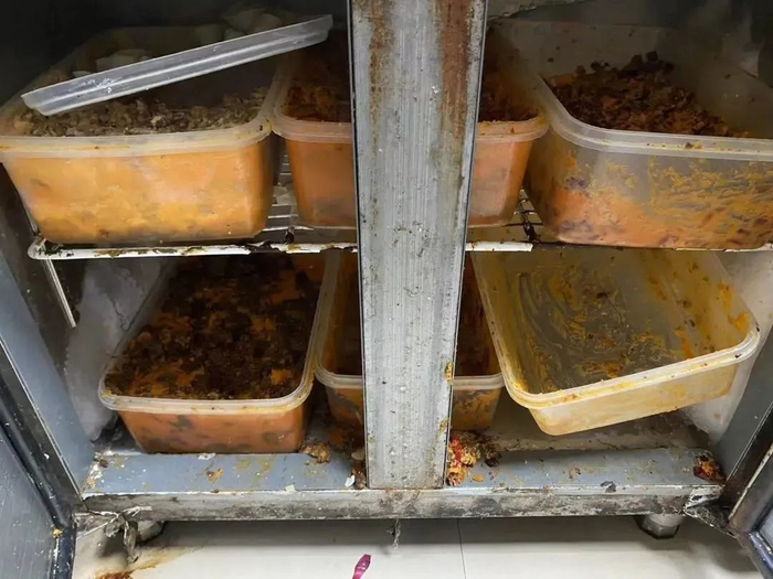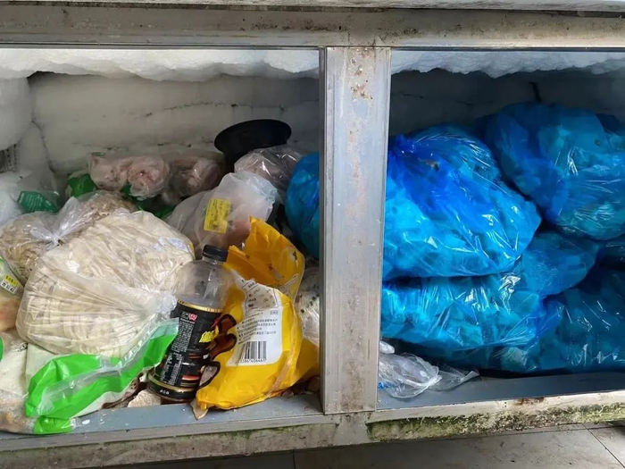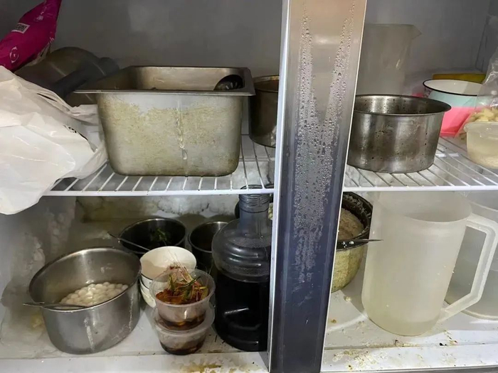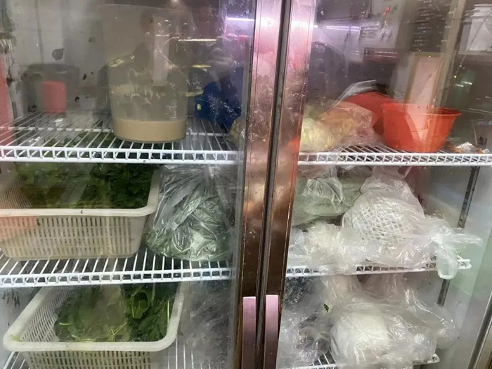 3、冰箱有积垢,食品原料混乱叠放。
