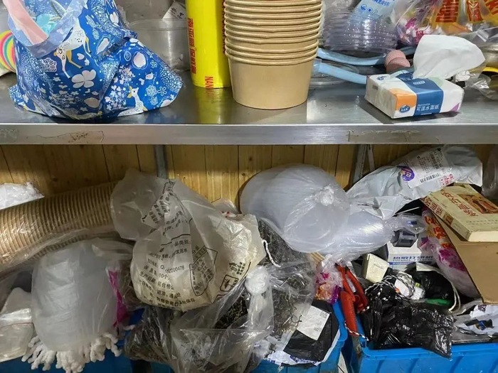 2、货架上各类物品杂乱堆放。