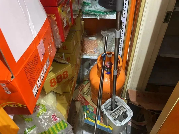 5、食品货架堆放杂乱,清洁工具存放在食品货架处。