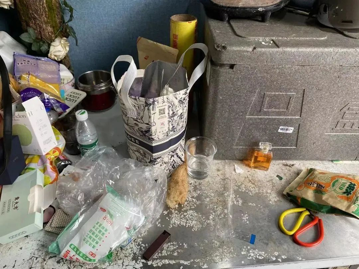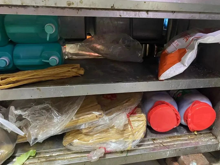 3、食品与非食品混放,柜子脏乱。