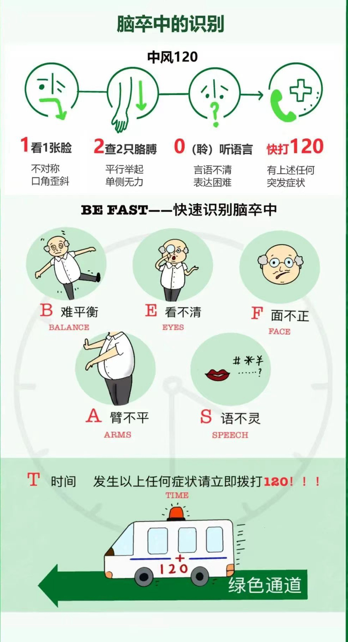 “脑卒中早识别早治疗是关键,得到规范的治疗恢复效果好。”张帆表示,中风的发生往往很突然,可能前一秒还在走路说笑,下一秒就完全失去运动和语言功能了;但是脑卒中早期症状也可能不明显,识别脑卒中可以牢记“BEFAST原则”,或者用“卒中120”识别法。