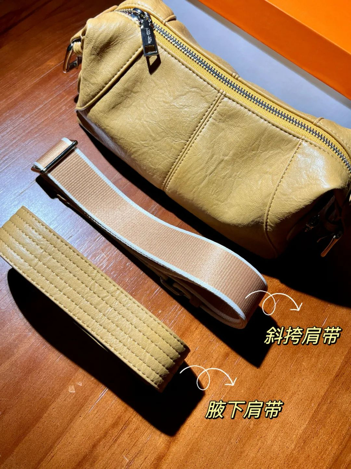 2 条不同材质的宽肩带,腋下款是PU皮的,斜挎款是尼龙材质的。